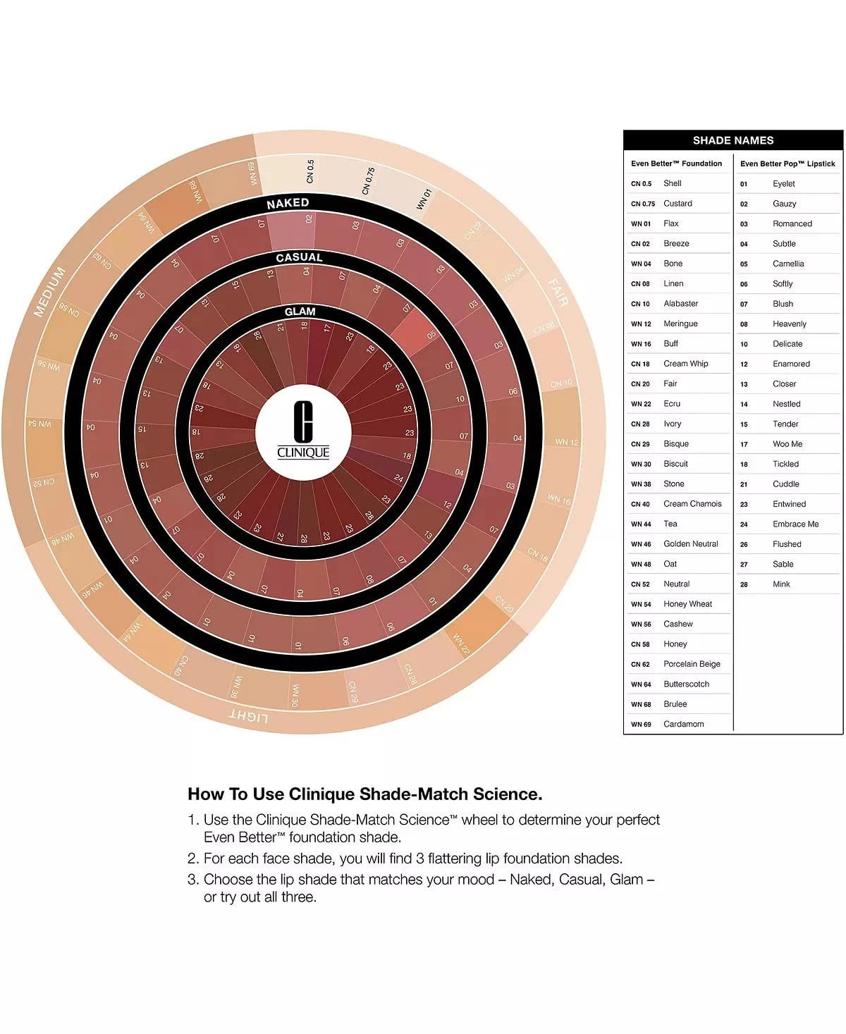 What it does: This lipstick contains vitamin E along with additional lip-nourishing ingredients to moisturize and condition while delivering long-lasting color that stays for up to eight hours. Flatter your individual complexion using Clinique Shade-Match Scienceâ„¢. Using a unique algorithm, Clinique can provide shades that will look the best on you based on your skin tone and undertone. Use the Clinique Shade-Match Science Wheel to discover your three perfect shades for three different looks: Naked, Casual and Glam. How to use: How to use: Use the Clinique Shade-Match Science wheel to determine your perfect face foundation shade. For each face shade, you will find three flattering lip foundation shades. Choose the shade that matches your mood-Naked, Casual or Glam-or try out all three.